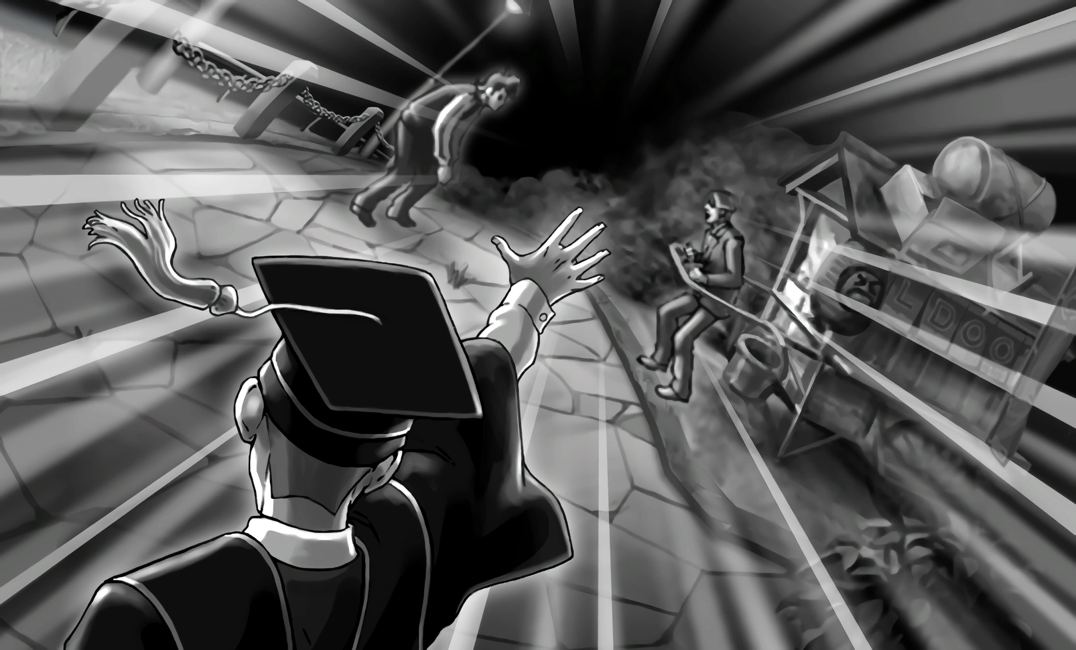Камера показывает другого мужчину, преграждающего путь бойцу. Когда камера начинает приближаться, появляется вспышка от выстрела. Камера ускоряется, показывая часть парка, а затем скрывает сцену за башнями.