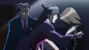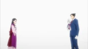 - Майя просит Феникса стать её адвокатом, в то же время он просит её, и двое комично ударяются головами о разделяющее их стекло, благодаря друг друга.